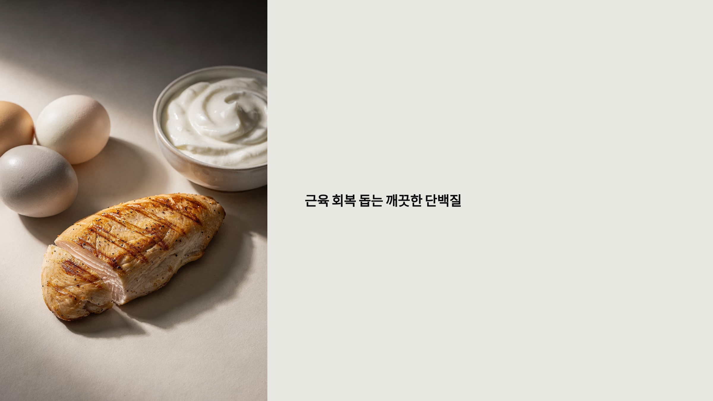 기름기가 적은 닭가슴살, 흰살 생선, 달걀 흰자, 두부 등을 주재료로 선택하세요. 이런 양질의 단백질은 칼로리는 낮으면서도 근육 회복에 필요한 아미노산을 풍부하게 공급해준답니다. 조리법은 튀기거나 굽는 것보다 삶거나 찌는 방식이 회복기에 더 좋아요.