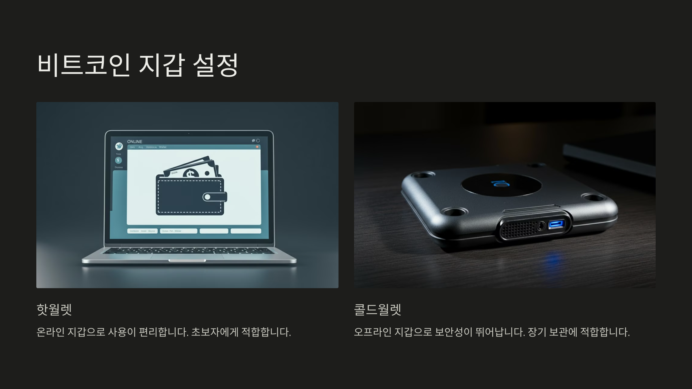 핫월렛(온라인 지갑)과 콜드월렛(오프라인 지갑) 중 선택하세요.