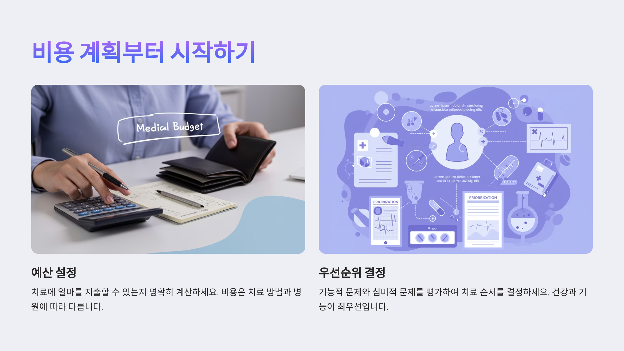 병원 상담을 통해 예상 비용을 받아보고, 치료에 필요한 세션 수와 추가 비용까지 미리 확인하세요. 여기에 사후 관리 비용도 포함해 현실적인 예산을 세우는 것이 좋아요. 계획 없이 치료를 시작하면 예상치 못한 지출로 경제적 부담이 커질 수 있어요.