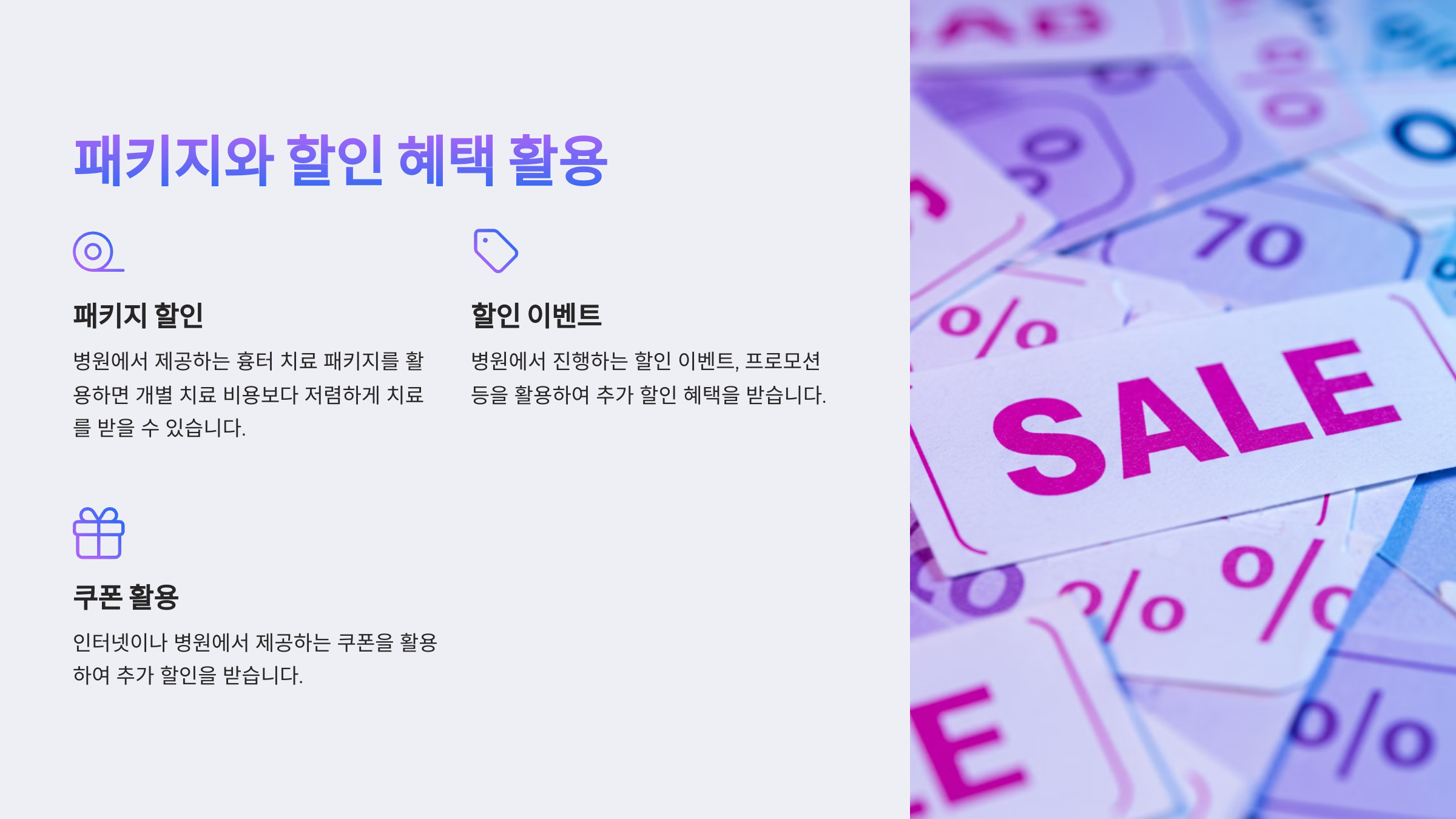 또한, 특정 시즌이나 이벤트 기간에 병원에서 제공하는 특별 할인 혜택을 놓치지 마세요. 여름이나 겨울 방학 시즌에는 병원에서 학생 할인이나 시즌 할인 같은 프로모션을 진행하는 경우가 많아요.
