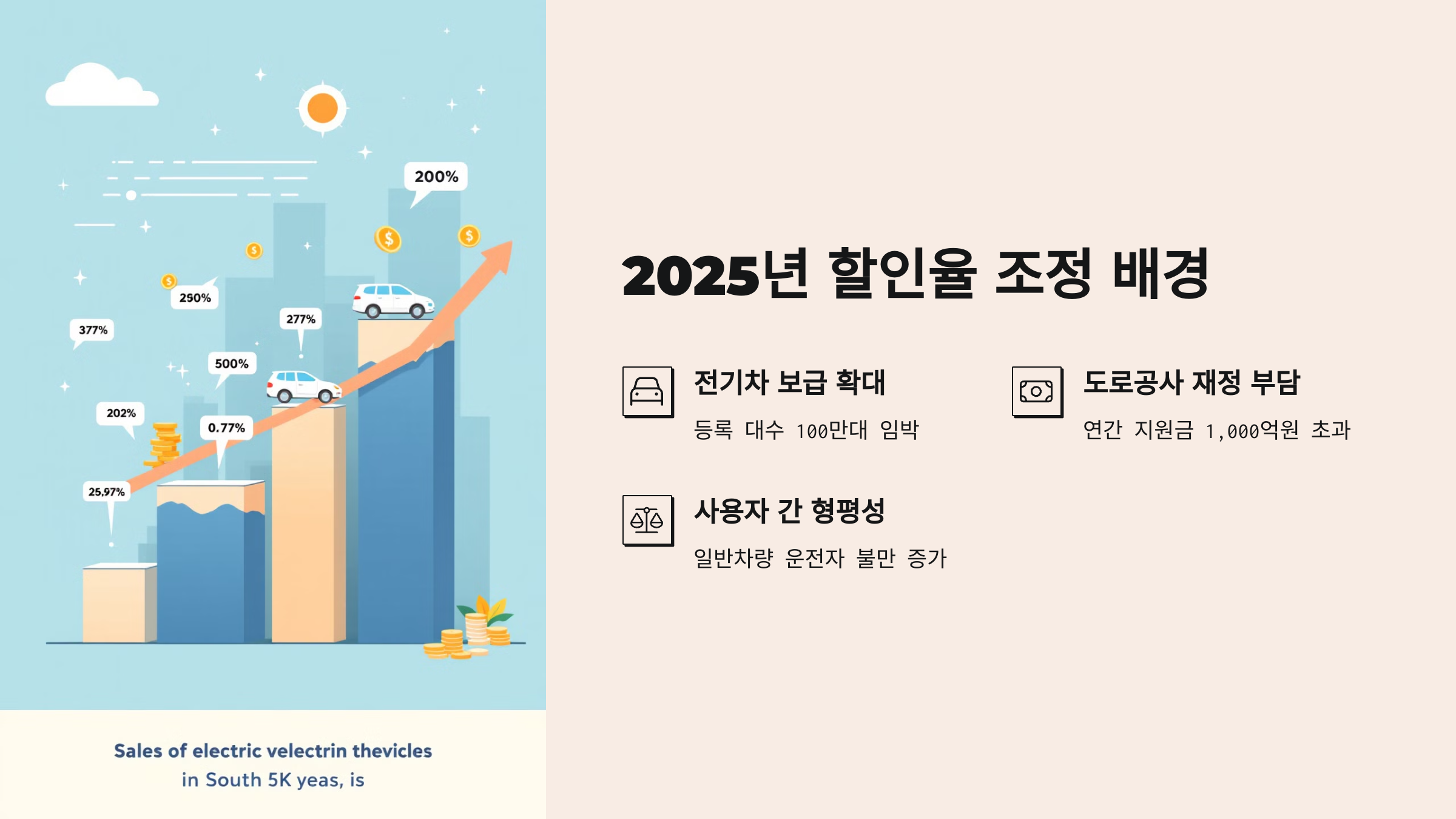 또 하나 중요한 배경은 **도로공사의 운영비 부담 증가**예요. 할인율이 클수록 그만큼 부족한 통행료 수입을 메워야 하는데, 전기차 수가 많아지면서 재정 부담이 커졌어요. 특히 고속도로 유지보수비와 인프라 확충 예산이 갈수록 늘어나고 있거든요.