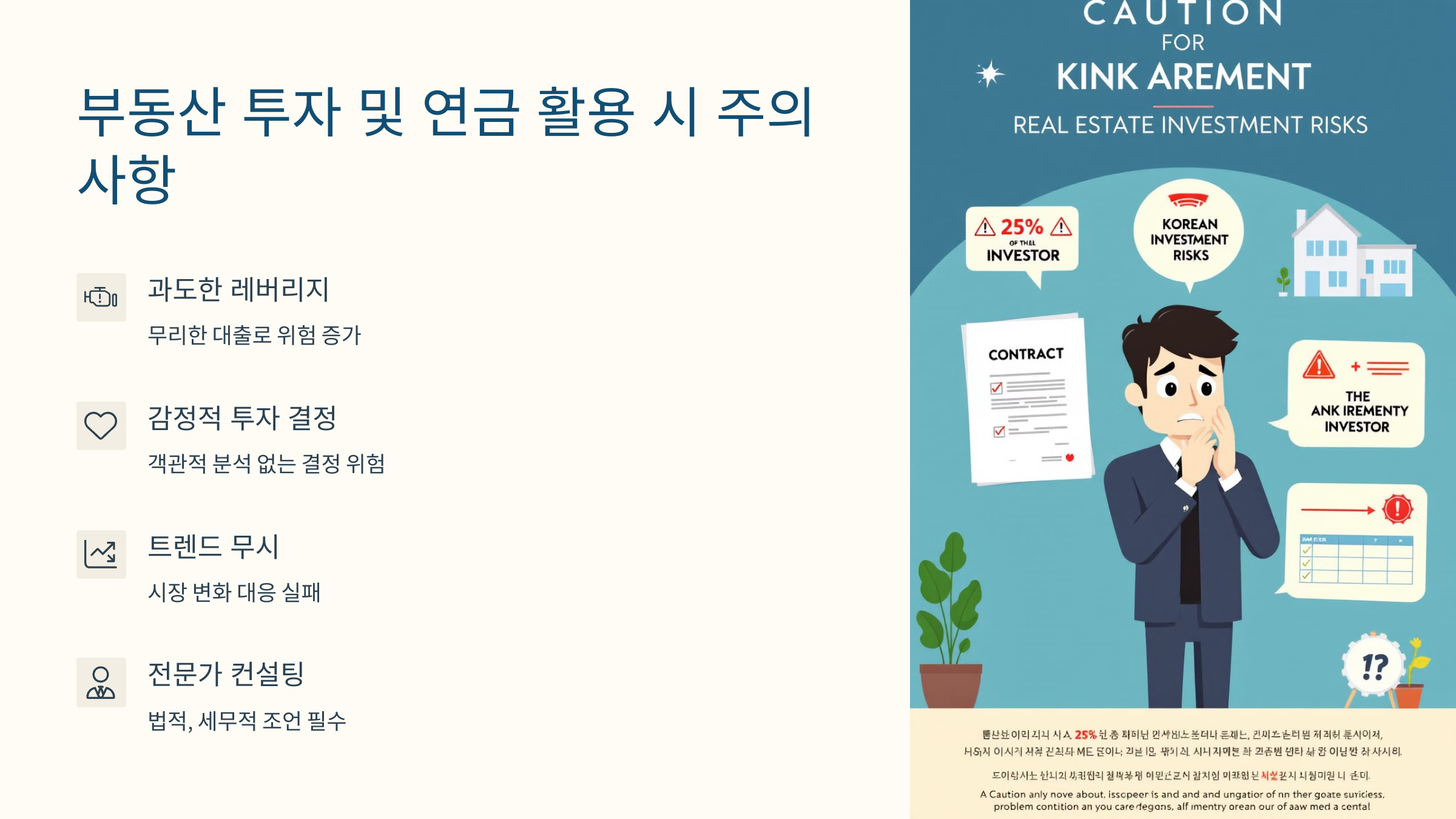 부동산 투자와 연금 활용은 장기적인 재정 계획을 세우는 중요한 방법이에요. 하지만 잘못된 접근 방식이나 계획 부족으로 인해 예상치 못한 손실을 입을 수도 있어요. 이 섹션에서는 주의해야 할 점들을 살펴볼게요. 🔍