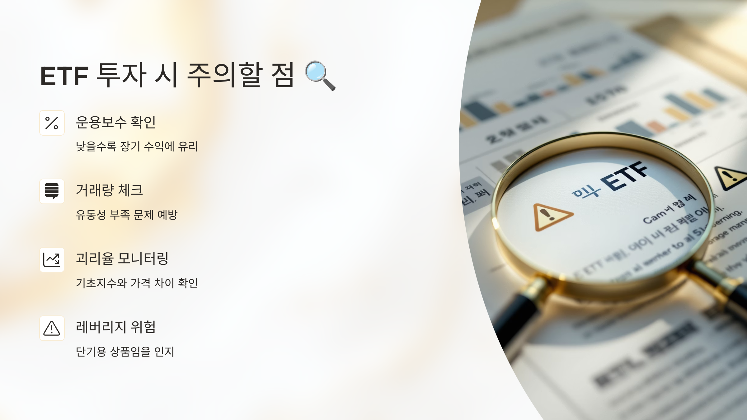 ETF는 안전한 투자 상품처럼 보이지만, 무조건 손실이 없다는 의미는 아니에요. 구조가 단순하다고 해서 리스크가 없는 건 아니죠. 특히 초보자라면 몇 가지 중요한 주의 사항을 꼭 기억해야 해요.