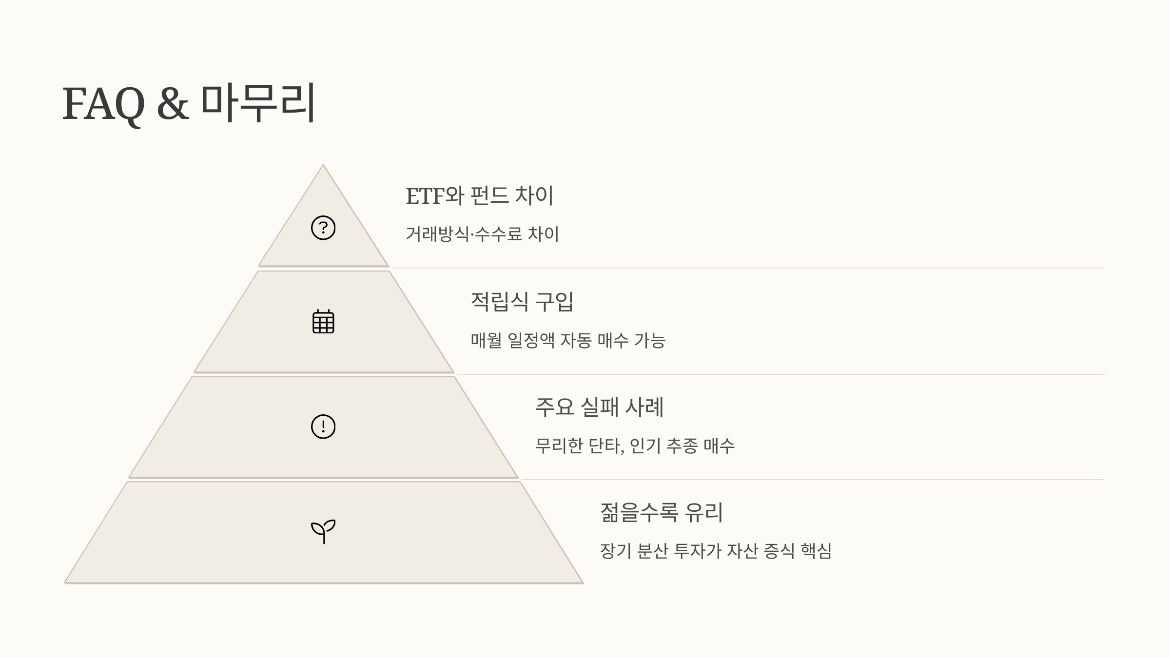 ETF는 느리지만 꾸준하게 자산을 키워가는 최고의 도구예요. 성급하게 수익만 보지 말고, 나만의 투자 원칙을 정하고 지켜보세요. 그 습관이 미래의 부를 만들어줄 거예요. 🌱