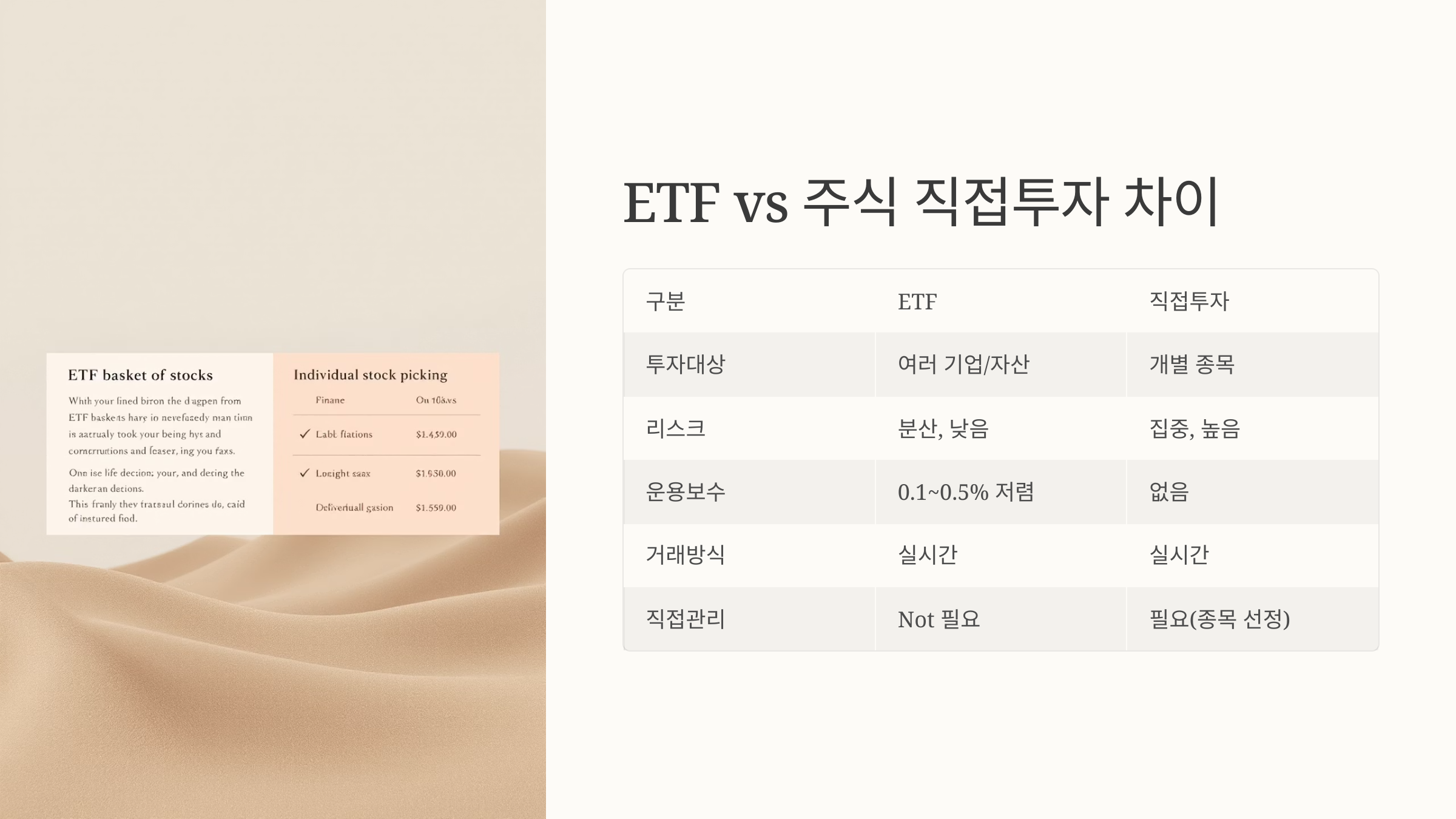 ETF와 주식 직접투자는 겉으로 보면 비슷해 보여요. 둘 다 주식처럼 거래하고, 가격이 실시간으로 변동되니까요. 하지만 실제로는 성격이 꽤 달라요. 특히 20대처럼 이제 막 투자를 시작하는 사람이라면 이 차이를 정확히 아는 게 중요해요.