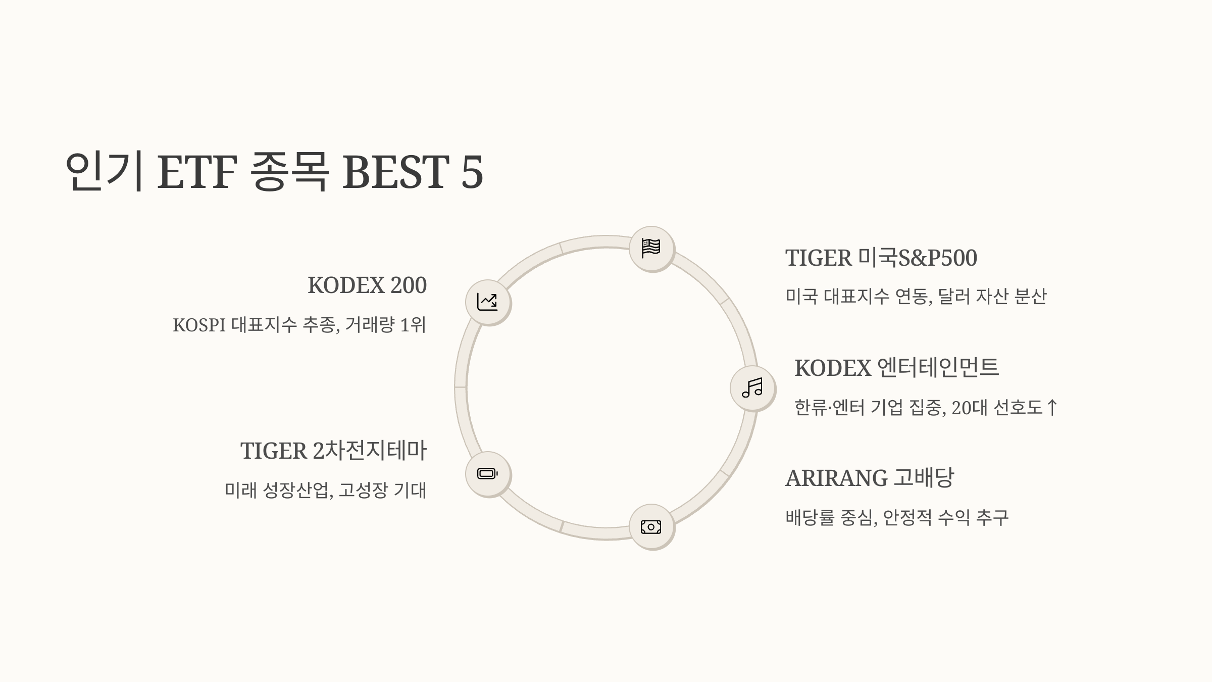 ETF가 많다 보니, 처음 시작할 때는 어떤 종목을 고를지 참 고민돼요. 그래서 오늘은 투자자들 사이에서 안정성과 수익성 모두 인정받은 인기 ETF 5종을 소개할게요. 국내 ETF부터 해외 ETF까지 다양하게 준비했으니 참고해보세요! 🎯