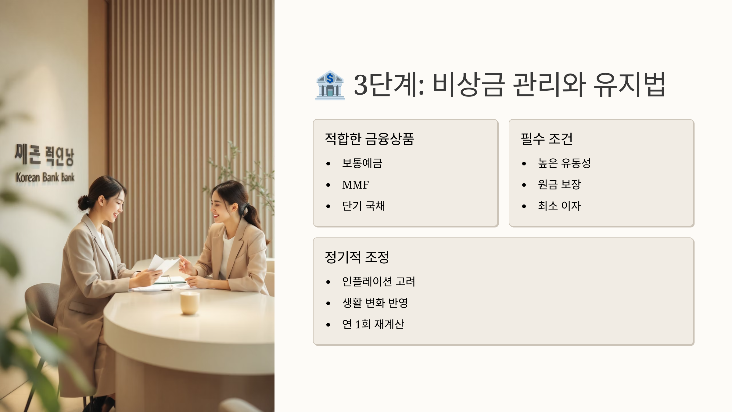 이 단계에서 중요한 건 ‘목표 금액’과 ‘관리 방법’을 구체화하는 거예요. 내가 준비한 금액이 실제로 어떤 위기까지 커버 가능한지 계산해보는 습관도 들여보세요. 🧠