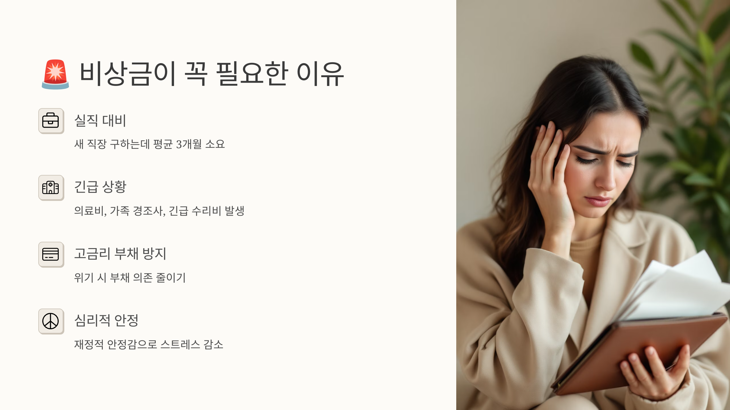 예를 들어 갑자기 실직했을 때, 비상금이 없다면 카드론이나 마이너스 통장 같은 고금리 대출에 의존하게 돼요. 이렇게 되면 빚은 늘어나고 재정 상황은 더 악화돼요. 반면 비상금이 있다면 최소 몇 달은 버틸 수 있어요.