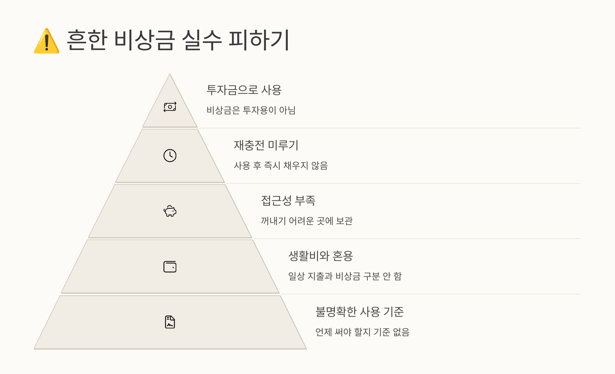 비상금은 잘 모아두면 든든한 안전망이 되지만, 작은 실수 하나로 무너지기도 해요. 실제로 많은 사람들이 비상금을 모으면서도 몇 가지 공통적인 실수를 반복하곤 해요. 이 부분만 잘 피하면 비상금은 정말 강력한 무기가 된답니다. 🧨