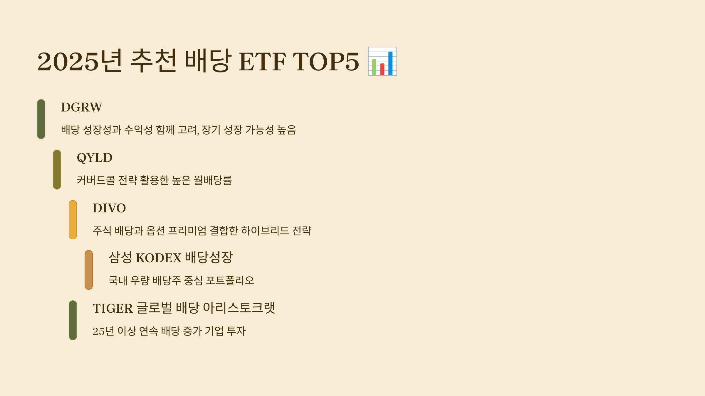배당 ETF는 '꾸준히'가 핵심이에요. 수익률이 화려하진 않아도 시장이 흔들릴 때마다 그 꾸준함이 큰 힘이 되어준답니다! 다음 섹션에서는 2025년 주목해야 할 배당 ETF TOP5를 구체적으로 소개해드릴게요 📈