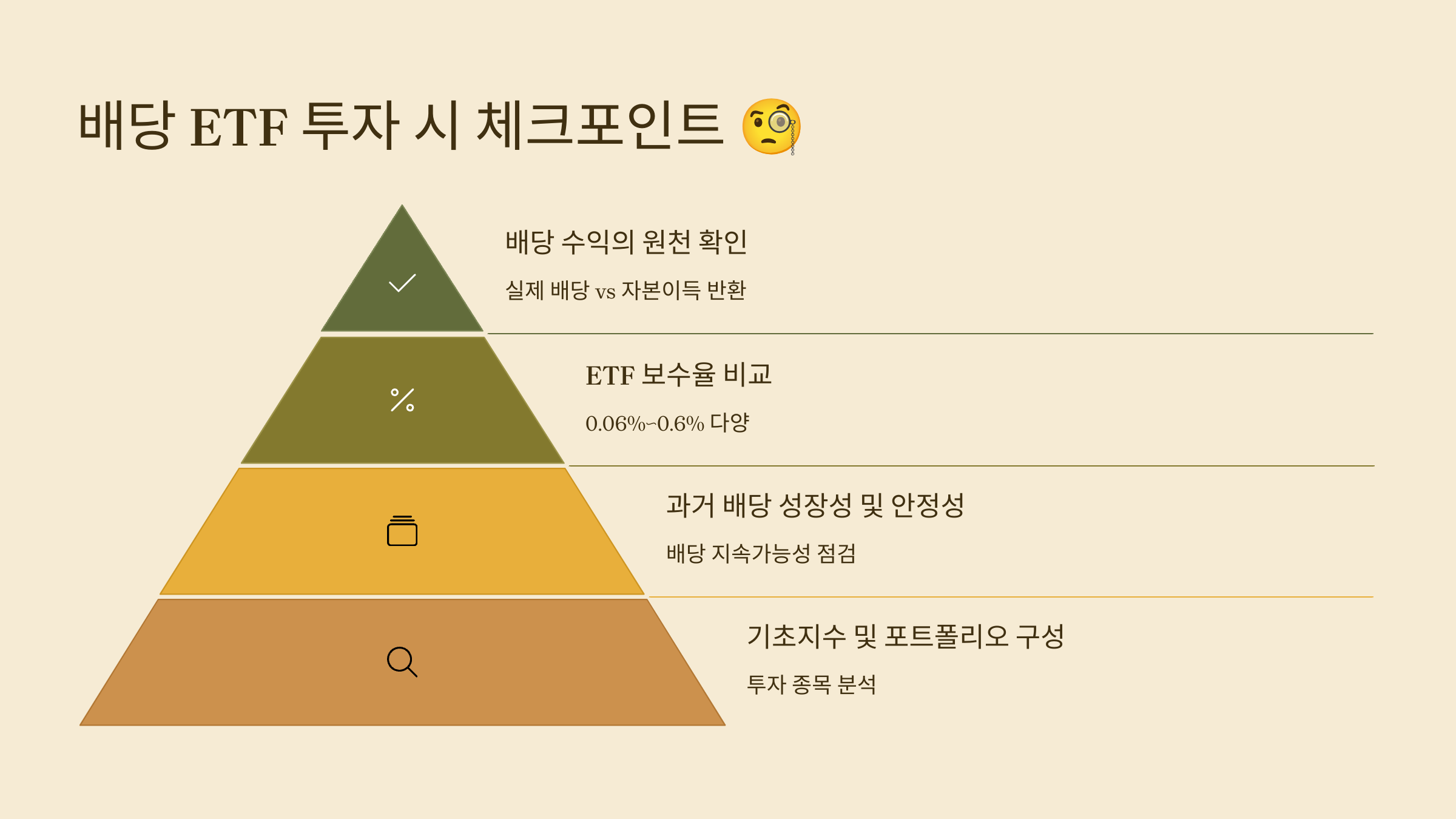 배당 ETF는 매력적인 투자 수단이지만, 무작정 투자하기보단 몇 가지 핵심 포인트를 잘 살펴보는 게 중요해요. 특히 수익률, 구성 종목, 수수료, 배당 주기 등은 반드시 확인해야 할 요소들이에요.