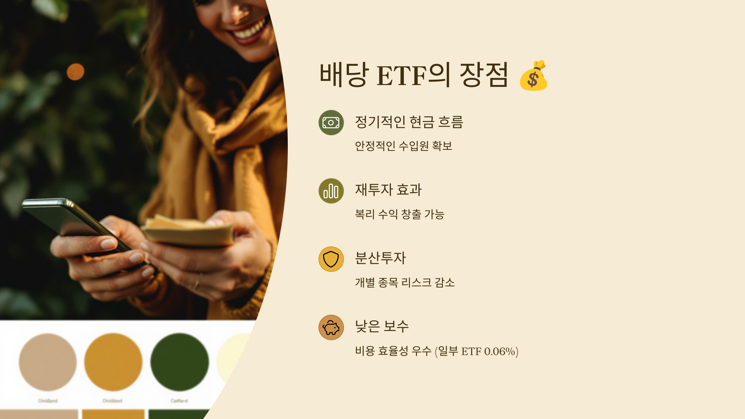 두 번째는 '리스크 분산'이에요. 개별 고배당주에 투자하면 한 회사의 실적에 따라 손실을 볼 수 있지만, 배당 ETF는 여러 종목으로 구성돼 있어서 리스크를 나눌 수 있어요.