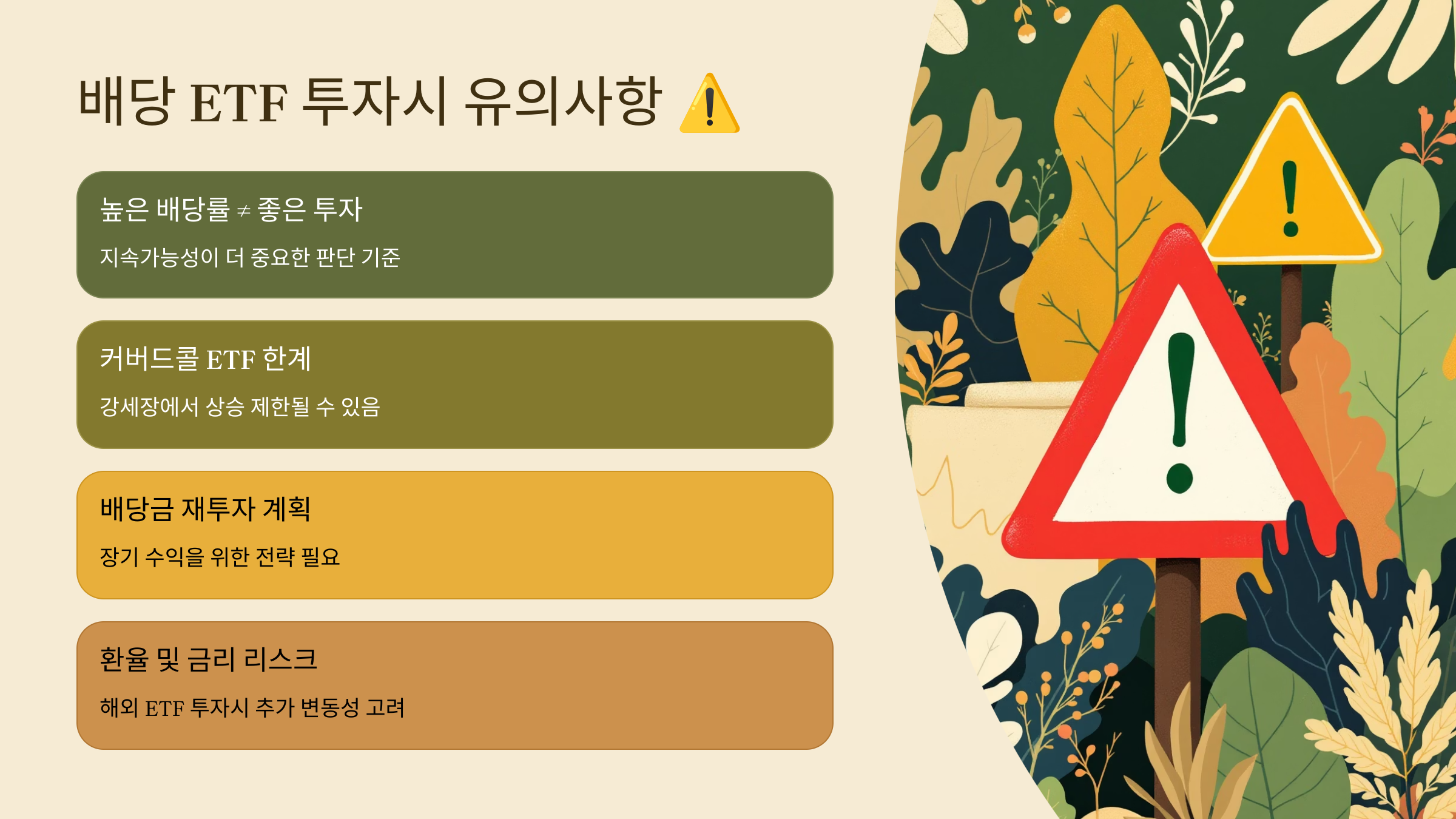 배당 ETF는 안정적인 수익을 제공하지만, 무조건 안전한 건 아니에요. 투자 전에 꼭 알아야 할 유의사항들이 있어요. 이 부분을 간과하면 수익은커녕 손실을 볼 수도 있답니다.