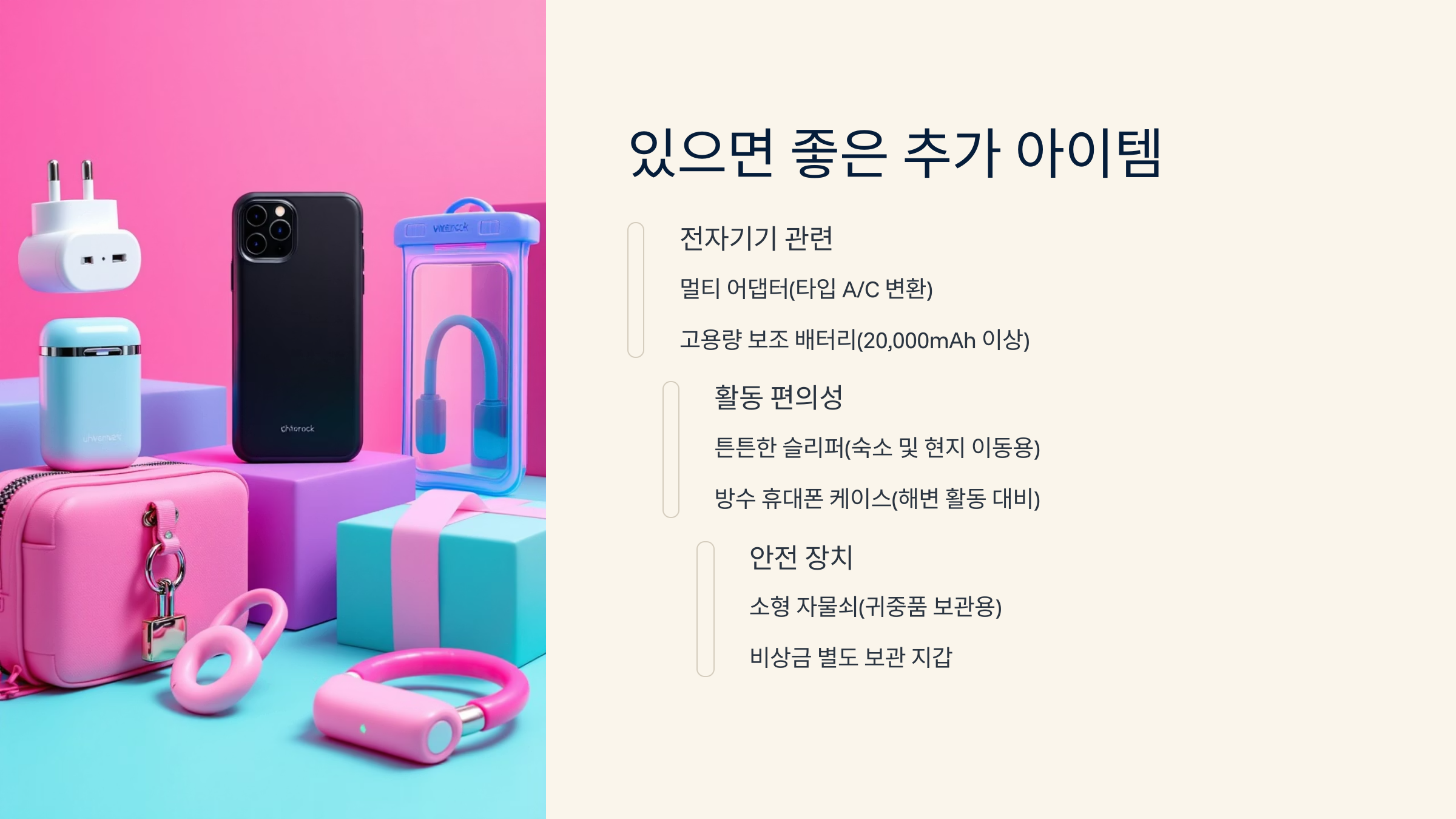 기본 준비물과 필수품 외에도 **있으면 여행이 훨씬 편해지는 추가템**들이 있어요! 꼭 필수는 아니지만 챙겨가면 “아 가져오길 잘했다~” 싶은 아이템들이죠. 저만의 경험과 추천을 바탕으로 정리해봤어요. 😄