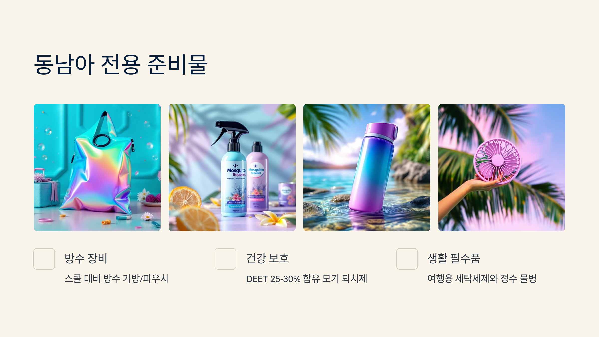 동남아 여행에서는 기본 준비물 외에도 **현지 특화 아이템**이 필요해요! 뜨거운 햇살, 높은 습도, 모기, 급작스러운 소나기까지 대비해야 하거든요. 한두 개만 빠져도 불편함이 크게 느껴질 수 있어요.